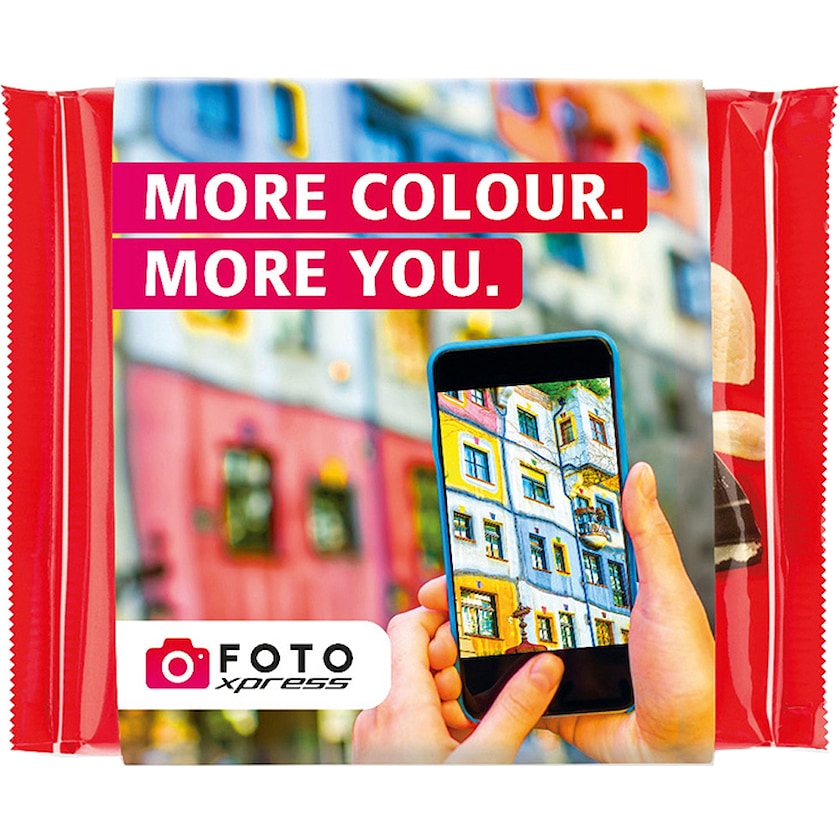 Klassische Ritter Sport, 100 Gramm, mit eigener Banderole im 4-Farbdruck. Wählen Sie zwischen viele Geschmacksrichtungen.