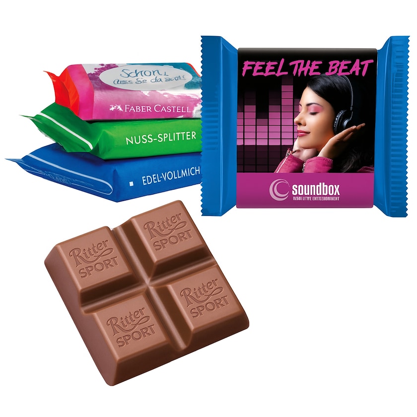 Klassische Ritter Sport Mini mit eigener 4-Farbdruck Banderole.