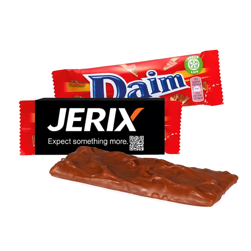Werben Sie mit Daim! 28 Gramm Daim Schokoladentafel, verpackt in einer Papphülle, die individuell mit Ihrem Aufdruck gestaltet werden kann.