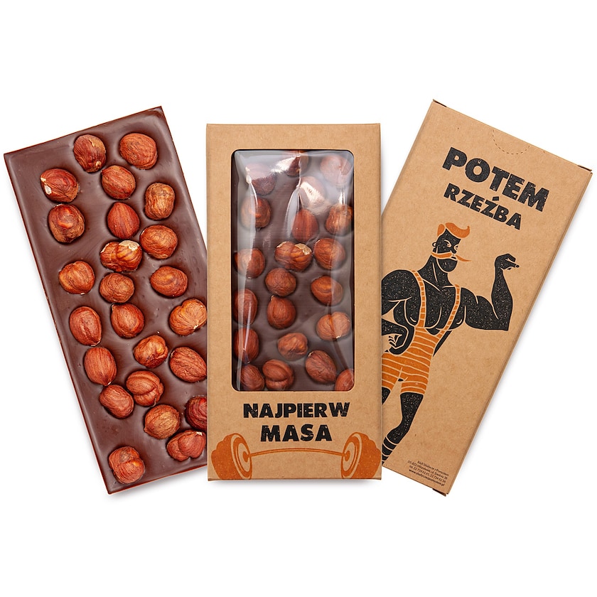 Schokoladenkuchen aus belgischer Milchschokolade und ganzen Haselnüssen. Die Milchschokolade hat einen Kakaoanteil von 44 % und ist wunderbar zart. Die Kartonverpackung verfügt über ein Sichtfenster und wird ganz nach Ihren Wünschen bedruckt.
