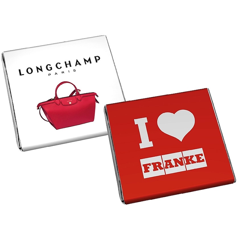 5g Schokostückchen ab einer Bestellmenge von 2000 Stück. Schokolade ist aus höchster Qualität und ist in den Geschmacksrichtungen weiße Schokolade, Zartbitter und Milchschokolade erhältlich. Die Folie ist in silber, gold, schwarz, blau oder rot erhältlich. Der Druck erfolgt im 4-Farb-Fotodruck.