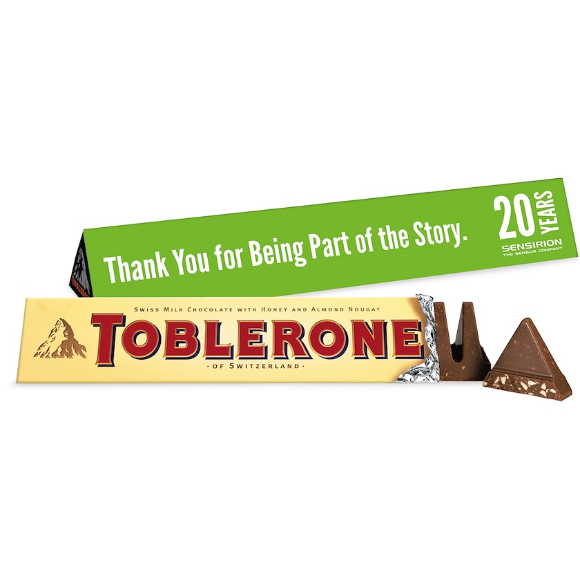 100 gr Tafel der schweizer Marke Toblerone. Wählen Sie aus drei verschiedenen Gschmacksrichtungen. Der Druck erfolgt auf einer Papphülse, die um die Originalverpackung kommt.