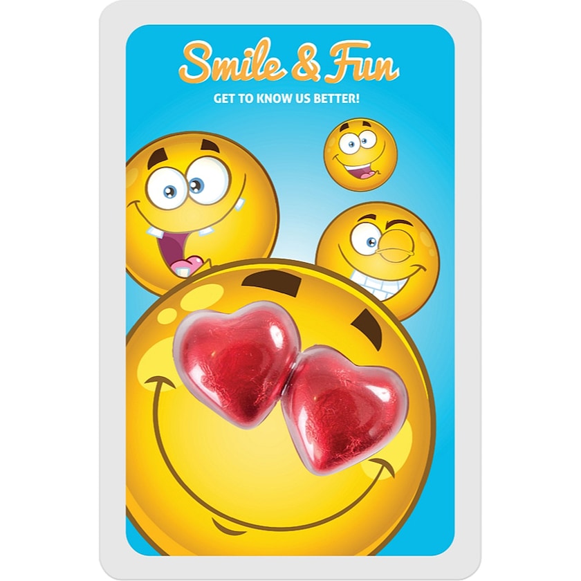 Karte mit 4-Farbdruck und zwei Schokladenherzen in einer Blisterverpackung. DIe Schokladenherzen sind aus Milchschokolade und wiegen insgesamt 10 g. Wählen Sie zwischen roter, silberfarbener oder goldfarbener Folie.