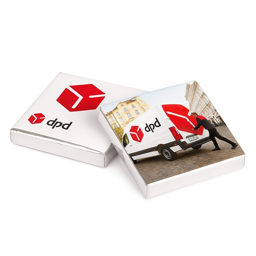 Schokoladenquadrat aus Fairtrade-zertifizierter Bio-Schokolade. Sie können zwischen Milchschokolade und dunkler Schokolade wählen. Sie können auch zwischen Silber- und Goldfolie wählen.