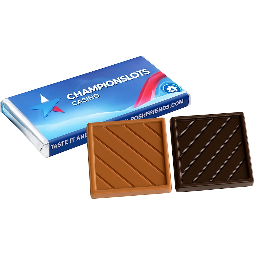 Zwei Schokoquadrate in einer Packung. Erhältlich sind die Schokoquadrate in den Geschmacksrichtungen Vollmilchschokolade 32% und Zartbitterschokolade 70%. Wählen Sie eine der Geschmacksrichtungen oder eine von jeder Geschmacksrichtung. Außerdem wählst Du aus, ob Du Silber- oder Goldfolie möchtest.