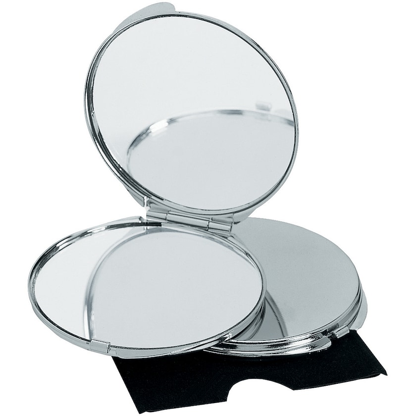Make-up Spiegel aus Metall. Noah hat eine normale Seite und eine vergrößernde Seite. Der Spiegel wird in schwarzer Samthülle geliefert. Die Markierung erfolgt mit Lasergravur.