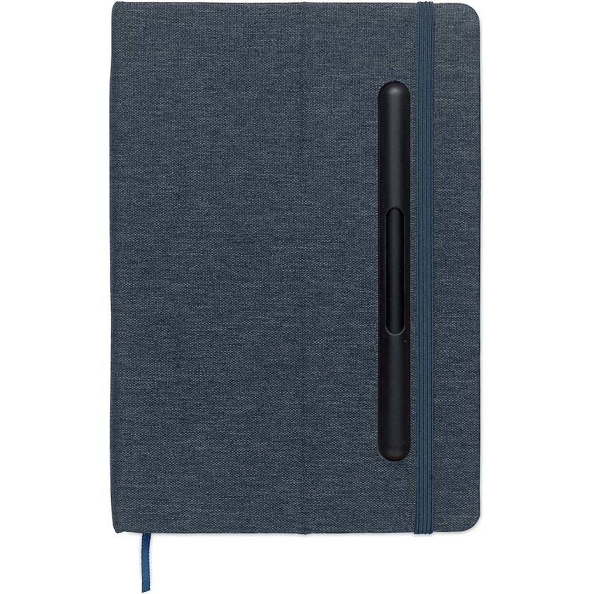 Notizbuch mit Stift und Halterung für ein Mobiltelefon. Der feste Einband besteht aus umweltfreundlichem rPET. Der Inhalt umfasst 96 linierte Seiten aus FSC-zertifiziertem Recyclingpapier. Der beiliegende Schreibstift verfügt sowohl über eine klassische Tintenmine als auch über eine Tintenfreischrift-Funktion.