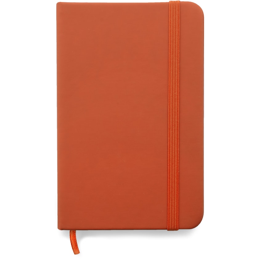 A6-Schreibblock aus Kunstleder mit 80 linierten Blättern. Die Ecken des Notizbuchs sind abgerundet, und es wird mit einem elastischen Band in passender Farbe verschlossen.