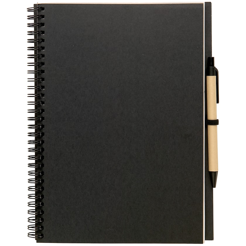 Umweltfreundlicher Spiralblock mit Stift. Block mit 70 unlinierten Seiten Recyclingpapier und einem Stift aus recycelten und biologisch abbaubarem Material.