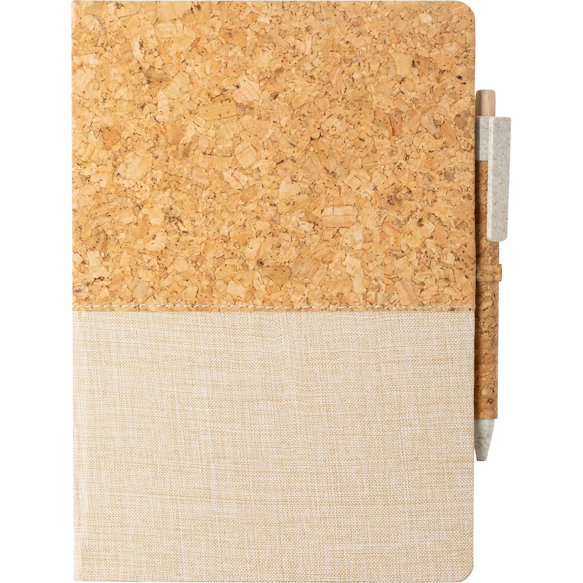 Notizbuch aus Baumwolle und Kork. Ein Stift aus Kork und einer umweltfreundlichen Mischung aus Weizenhalm und Kunststoff gehört zum Lieferumfang. Der Preis bezieht sich auf Druck auf dem Buch oder Stift.