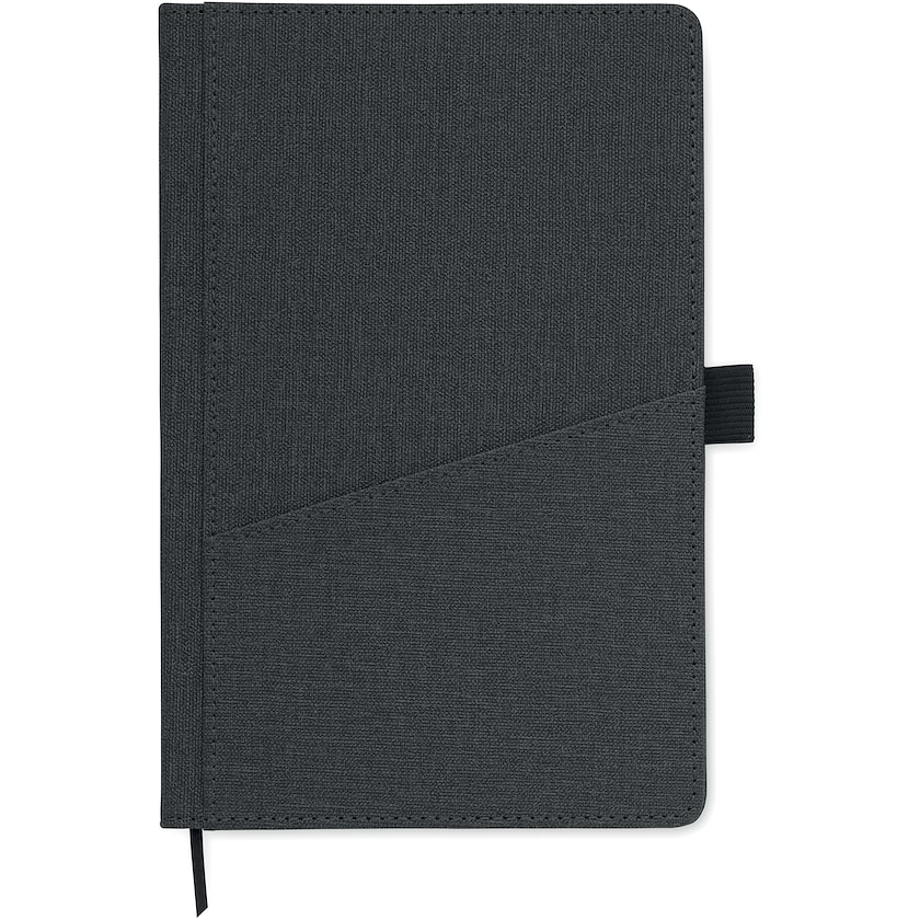 Notebook mit Handytasche auf der Vorderseite. Die Einlage besteht aus 80 linierten Blättern Recyclingpapier.