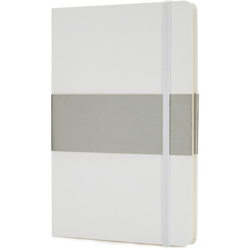A5-Schreibbuch mit Papierumschlag über die Vorder- und Hinterseite. Der Block hat cremefarbiges Papier mit schwarzen Linien und einen Gummiband-Verschluss.