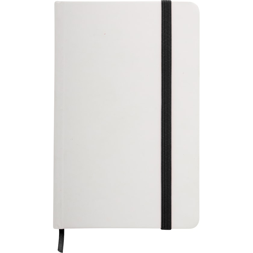 Weißer Schreibblock mit Kartonumschlag und Gummiband in Kontrastfarbe. Das Band ist ein hübsches Detail und ein praktisches Hilfsmittel, um wichtige Seiten mit einem Griff zu finden. Der Block hat 80 Blätter.