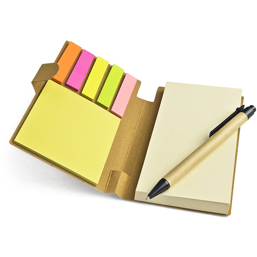 Notizblock mit Kugelschreiber, Klebezettel und Klebezettelnotizblock. Der Kugelschreiber besteht aus wiedergewonnenem Plastik und Papier. Der Block besteht aus Recyclingpapier. Bestelle einen umweltfreundlichen Notizblock mit Kugelschreiber bei Axon Profil!
