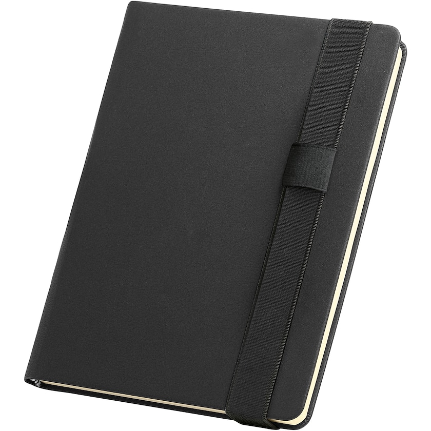 Notizbuch in A5-Größe mit hartem Umschlag aus Kunstleder. Notizbuch mit Stifthalter und 140 eierschalenweiße Blatt. Ohne Stift.
