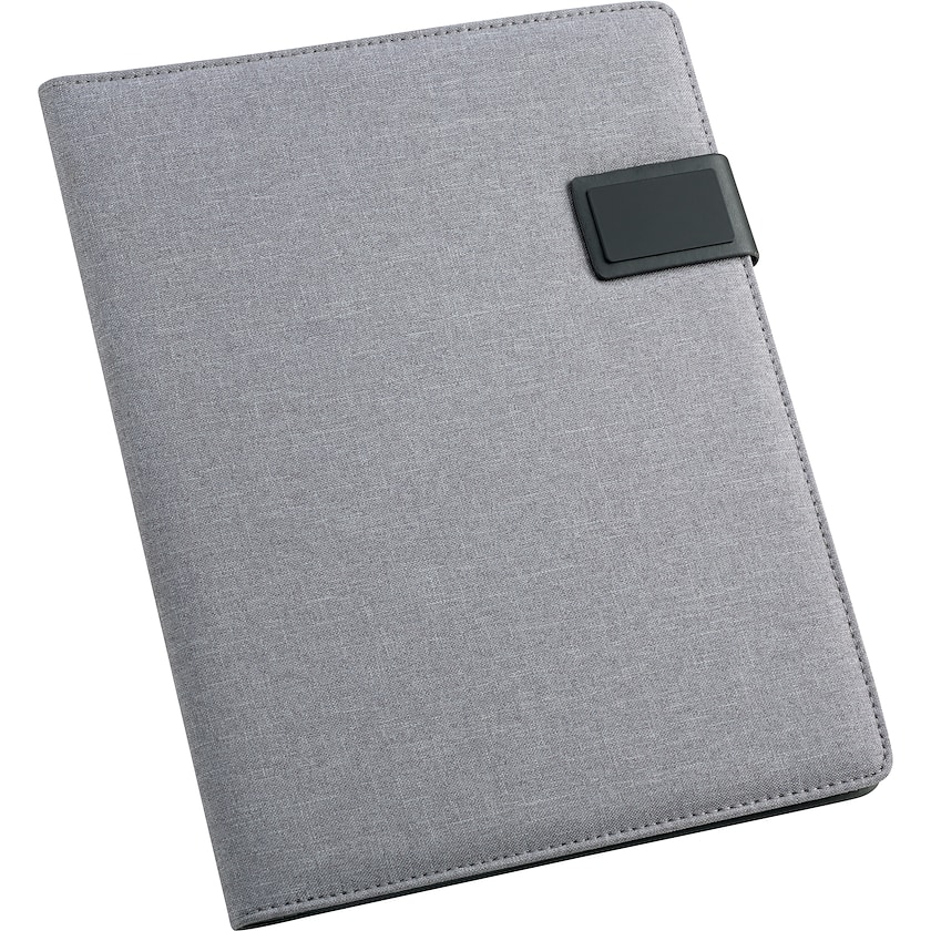 Konferenzmappe in A4-Größe mit Umschlag aus Stoff und Kunstleder. Die Mappe wird mit einem Magneten verschlossen. Innen befindet sich ein Schreibblock mit 20 linierten Blatt. Vorne befindet sich eine Metallplatte mit gummiertem Äußeren, die mit Lasergravur gekennzeichnet werden kann. Wird ohne Stift geliefert.