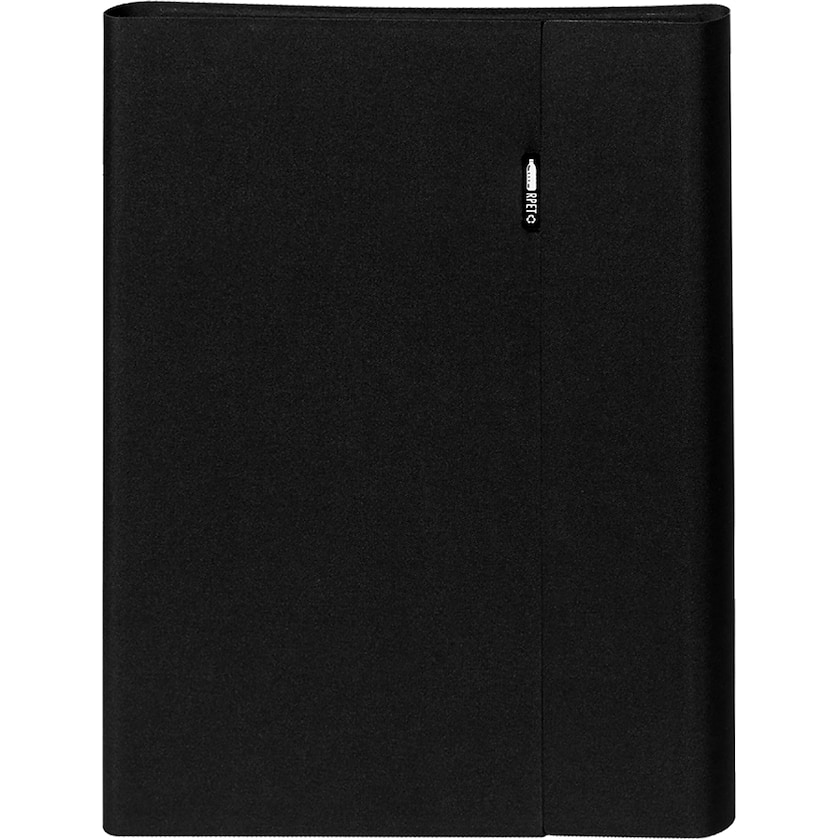 Elegante Konferenzmappe aus recyceltem Material. Die Konferenzmappe ist aus rPET (also recycelten PET-Flaschen) hergestellt. Im Inneren befindet sich ein Schreibblock mit 20 linierten Blättern. Die Mappe wird mit einem Magnetverschluss verschlossen gehalten.