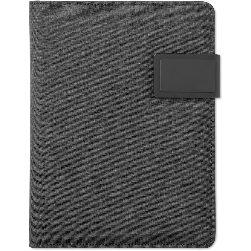 Konferenzmappe im A5-Format mit integrierter 4000 mAh Powerbank. Im Inneren befinden sich außerdem ein Schreibblock mit 20 Seiten, eine Handyhalterung und mehrere kleine Staufächer. Micro-USB-Kabel und C-Stecker sind eingebaut. Der Aufdruck kann in maximal zwei Farben erfolgen.