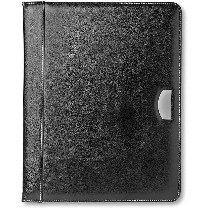 A4-Konferenzmappe aus Kunstleder. Wird mit Schreibblock mit 20 Blatt geliefert. Die Markierung erfolgt entweder mit Druck auf der Kunstlederfläche oder mit Lasergravur auf der Metallplatte.