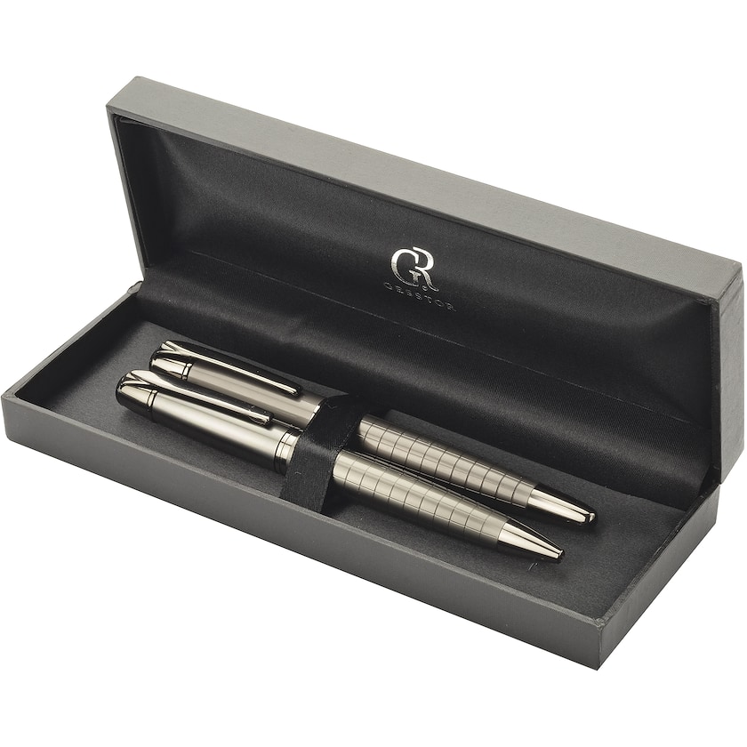 Luxuriöses Stiftset mit modernem Design. Das Set enthält einen Kugelschreiberund einen Tintenstift aus Metall. Das Preis für Lasergravur bezieht sich auf einen Stift. Eine perfekte Wahl für alles, die ein Stiftset mit modernem Design suchen. Beide Stifte haben schwarze Tinte.