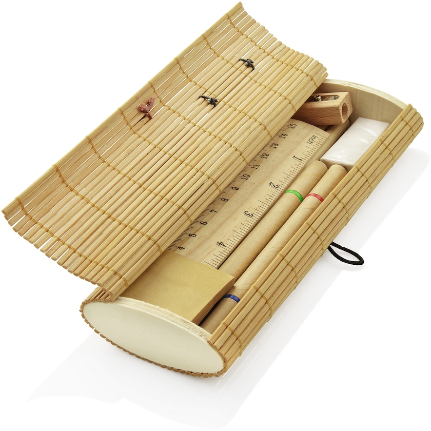 Hübsches Schreibset aus Bambus. Pennsetet innehåller två bläckpennor med rött, blått, svart och grönt bläck, två blyertspennor, radergummi, pennvässare och linjal i trä. Märkning sker med lasergravyr på en träbricka som finns på själva pennfodralet.
