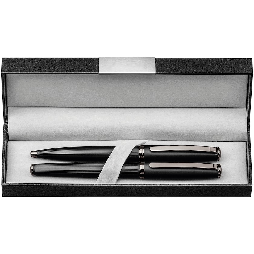 Exklusives Set mit zwei Metallstiften. Das Set enthält einen Kugelschreiber und einen Tintenstift. Jeweils mit blauer Tinte. Der Markierpreis bezieht sich auf den Druck oder die Lasergravur auf einem der Stifte.