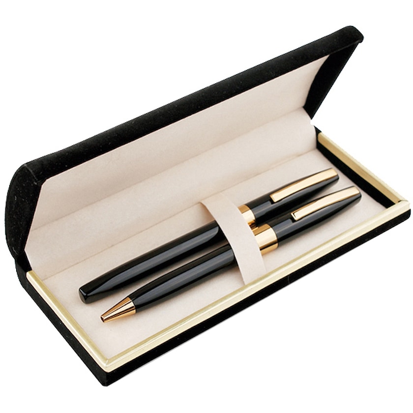 Elegantes Schreibset mit schwarzen Metallstiften mit Details in Goldchrom. Set enthält Kugelschreiber und Füller. Preis für Lasergravur gilt für beide Stifte.
