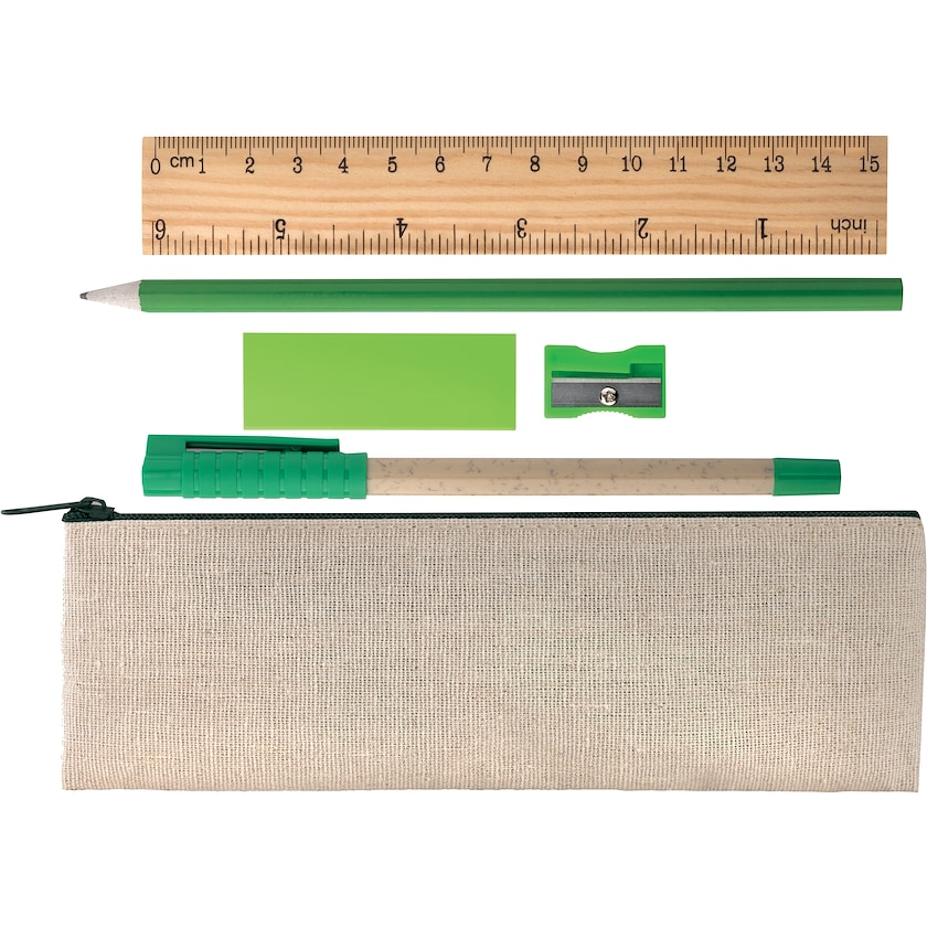 Stiftset mit sechs Teilen Das Set besteht aus einem Bambuslineal, einen Spitzer aus Holz, Radiergummi, Bleistift, Kugelschreiber und einem Federmäppchen aus Jute und Baumwolle. Der Kugelschreiber hat blaue Tine. Der Druck erfolgt auf den Bleistift.
