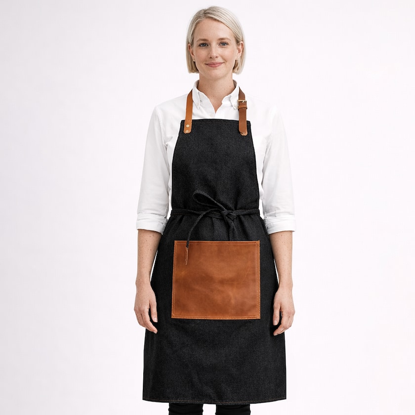 Exklusive Schürze aus stonewashed Baumwoll-Canvas. Die Schürze hat hochwertige Details aus Kunstleder. Eine Schürze, die mit der Zeit immer schöner wird!