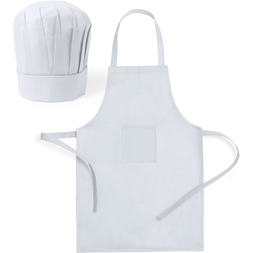 Set mit Schürze und Kochmütze für Kinder. Schürze und Kochmütze sind aus non-woven-Material. Die Schürze hat eine Tasche auf der Vorderseite. Ein lustiges Set für zukünftige Sterneköche.