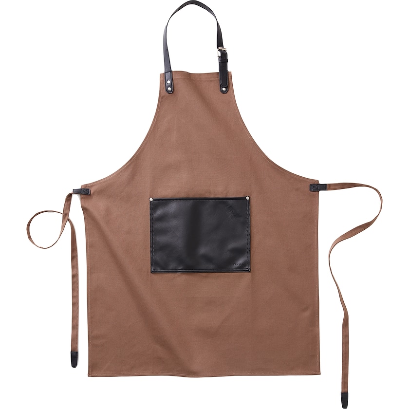Schürze aus Baumwoll-Canvas mit Details aus veganem Leder. Auf der Vorderseite befindet sich eine große Tasche. Eine hochwertige Schürze, die mit der Zeit immer besser wird.
