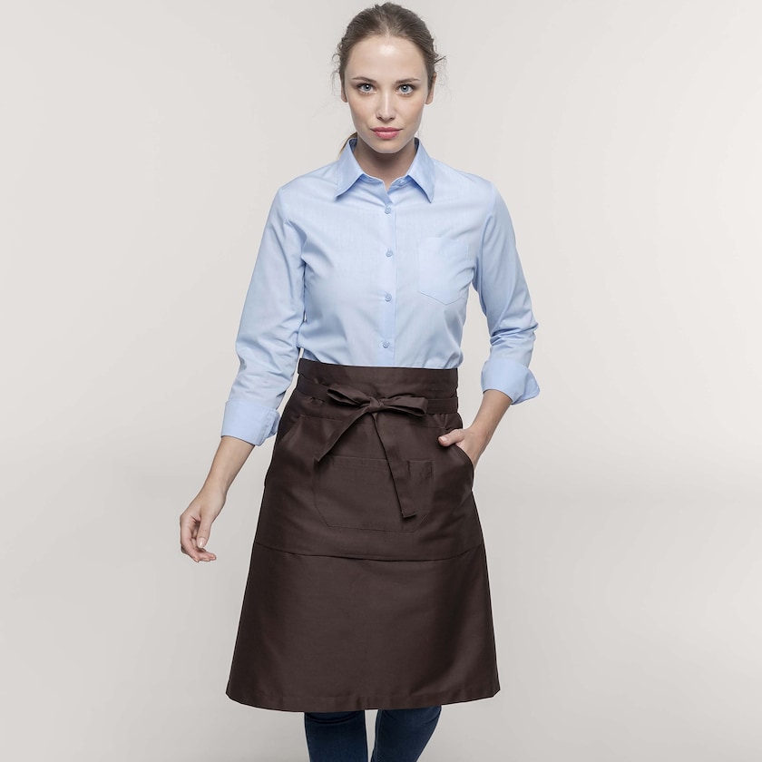 Schürze aus einer zuverlässigen Polyetsermischung. Die Schürze hat vorne eine Tasche und kleinere an den Seiten. Die Schürze ist 62,5 cm lang und 90 cm breit.