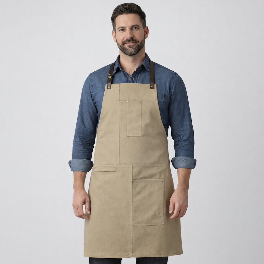 Elegante Schürze aus Baumwolle. Die Riemen sind aus Kunstleder. Mit einer großen und einer kleinen Tasche.