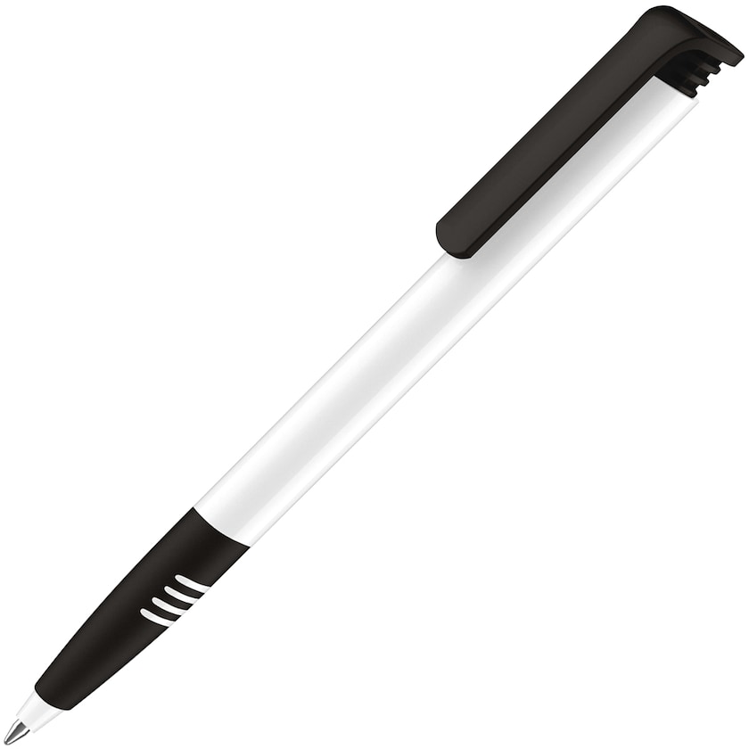 Preiswerter Kugelschreiber mit Grifffläche von Senator®. Der Kugelschreiber hat einen weißen Stiftkörper und Clip und Grifffläche in Kontrastfarbe. Wählen Sie zwischen blauer und schwarzer Tinte.
