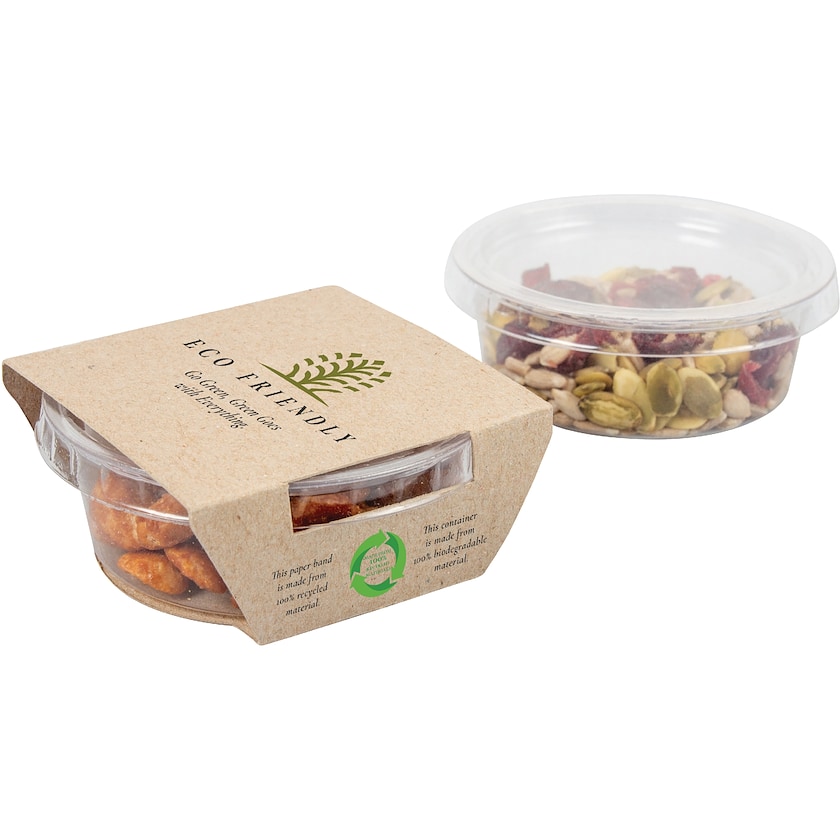 Eine gesunde Zwischenmalzeit in einer biologisch abbaubaren Verpackung. Wählen Sie aus verschiedenen Mischungen. Die Verpackung ist aus PLA, das 100 % biologisch abbaubar ist. Der Druck erfolgt auf einer naturfarbenen Papierhülle, die um der Verpackung liegt.