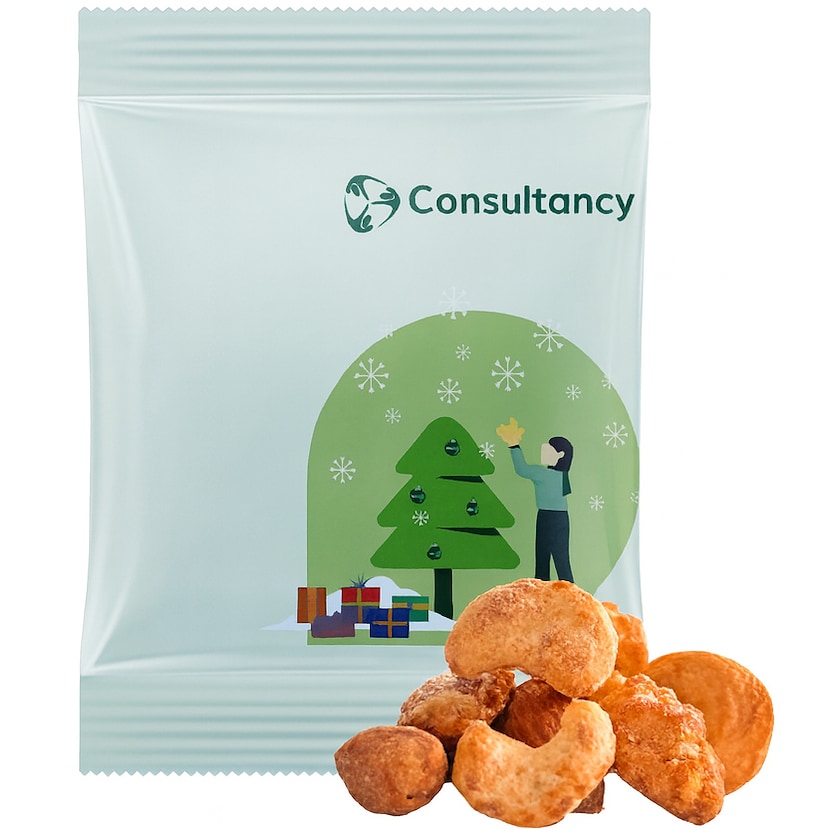 Karamellisierte Nussmischung mit salzigen Elementen. Die Mischung enthält Mandeln und Cashewnüsse, gewürzt mit Zucker, Zimt, Bourbon-Vanille und Salz. Die gesamte Verpackung wird nach Ihren Wünschen bedruckt.