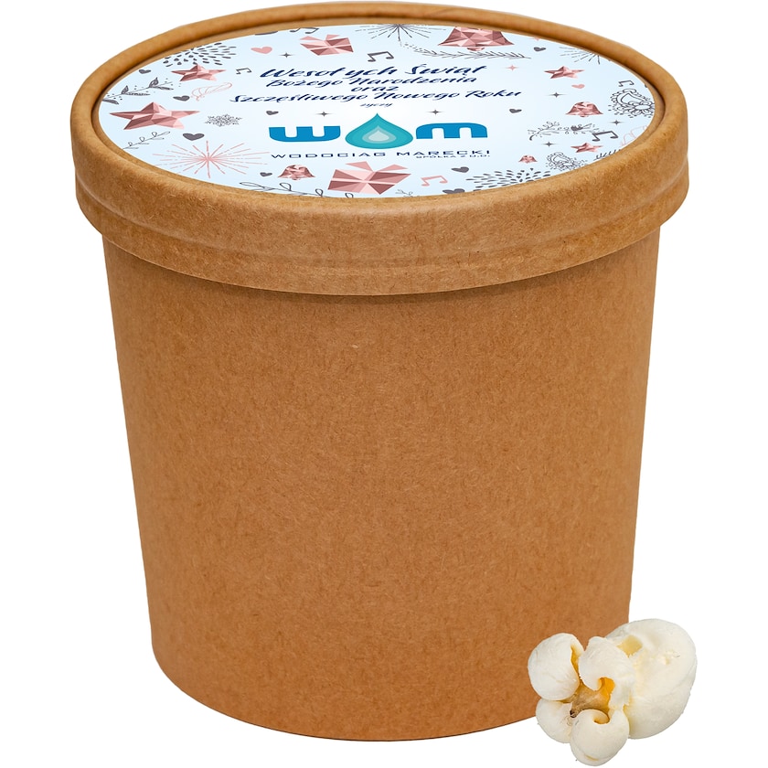 Vorgepopptes Popcorn in einer Pappschachtel. Der Karton ist aus naturfarbenem Papier hergestellt. Er ist auf einem am Deckel befestigten Etikett aufgedruckt.