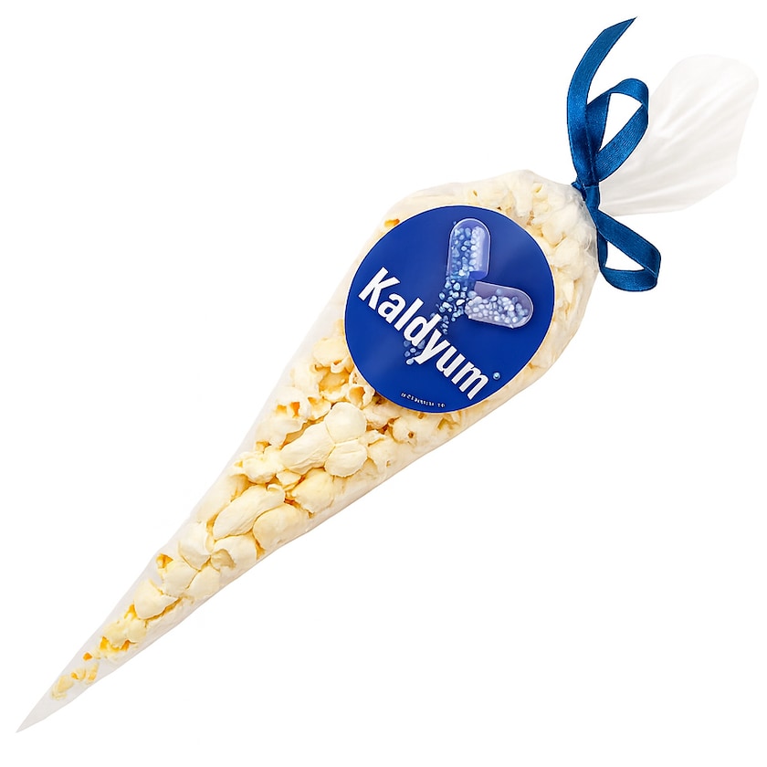Popcorntüte gefüllt mit gesalzenem Popcorn. Die Hülle besteht aus transparenter Kunststofffolie und wird mit einem Band verschlossen, das in verschiedenen Farben erhältlich ist. Das Bedrucken erfolgt über einen runden Aufkleber, der mit Ihrem individuellen Aufdruck auf die Hülle geklebt wird.