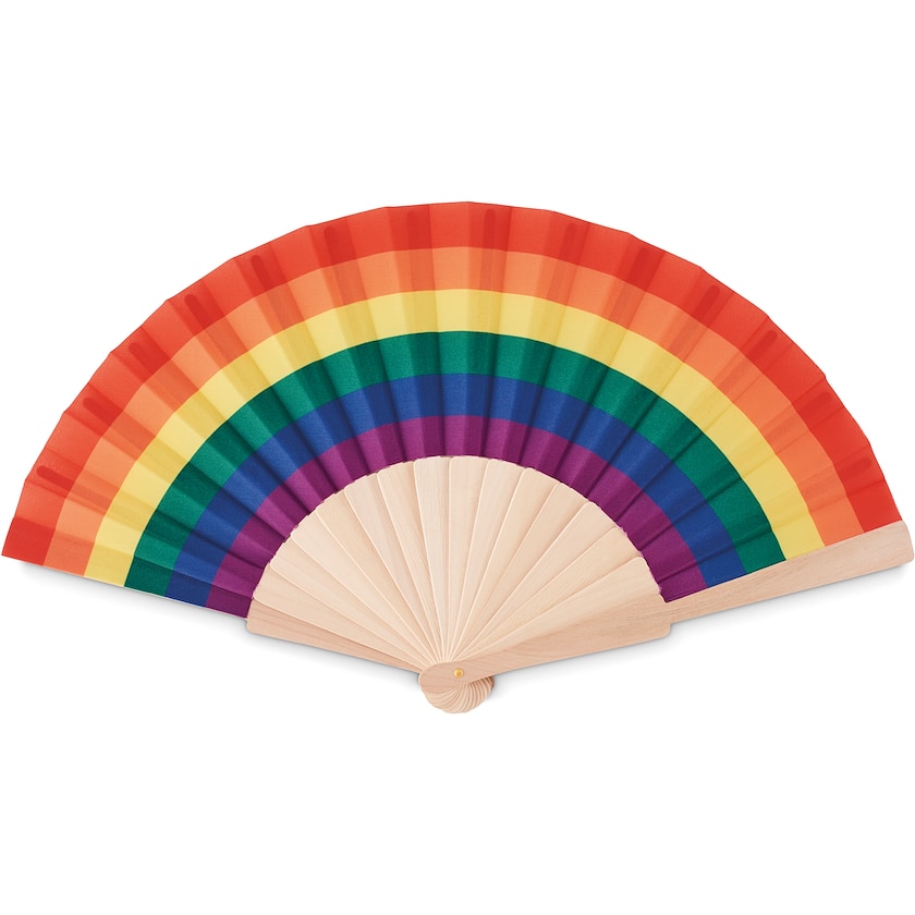 Regenbogenfarbener Fächer. Der Rahmen besteht aus Holz und der Stoff aus Polyester. Die Beschriftung erfolgt wahlweise mit Druck- oder Lasergravur auf dem Holzrahmen.