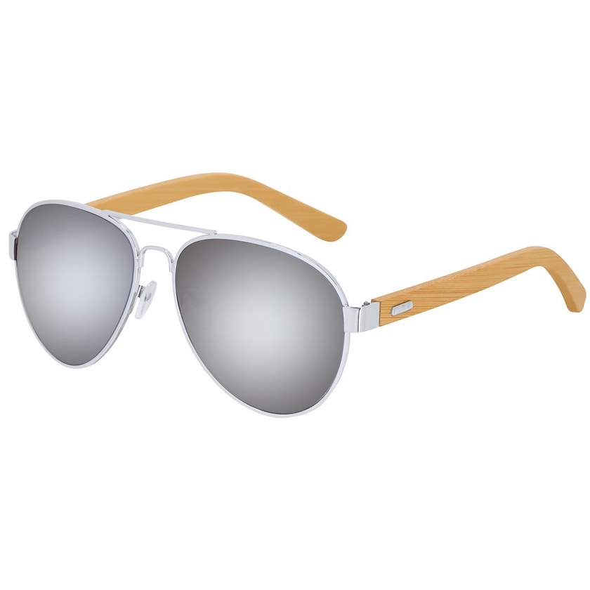 Pilotensonnenbrille mit verspiegelten Gläsern. Die Gläser verfügen über UV400-Schutz. Die Bügel sind aus Bambus gefertigt. Lieferung im Mikrofaserbeutel.