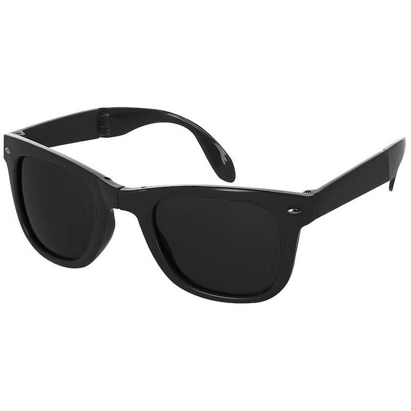 Faltbare, komplett schwarze Sonnenbrille bedrucken lassen. Die Gläser verfügen über UV400-Schutz. Wird in einem Brillenetui mit Reißverschluss geliefert.