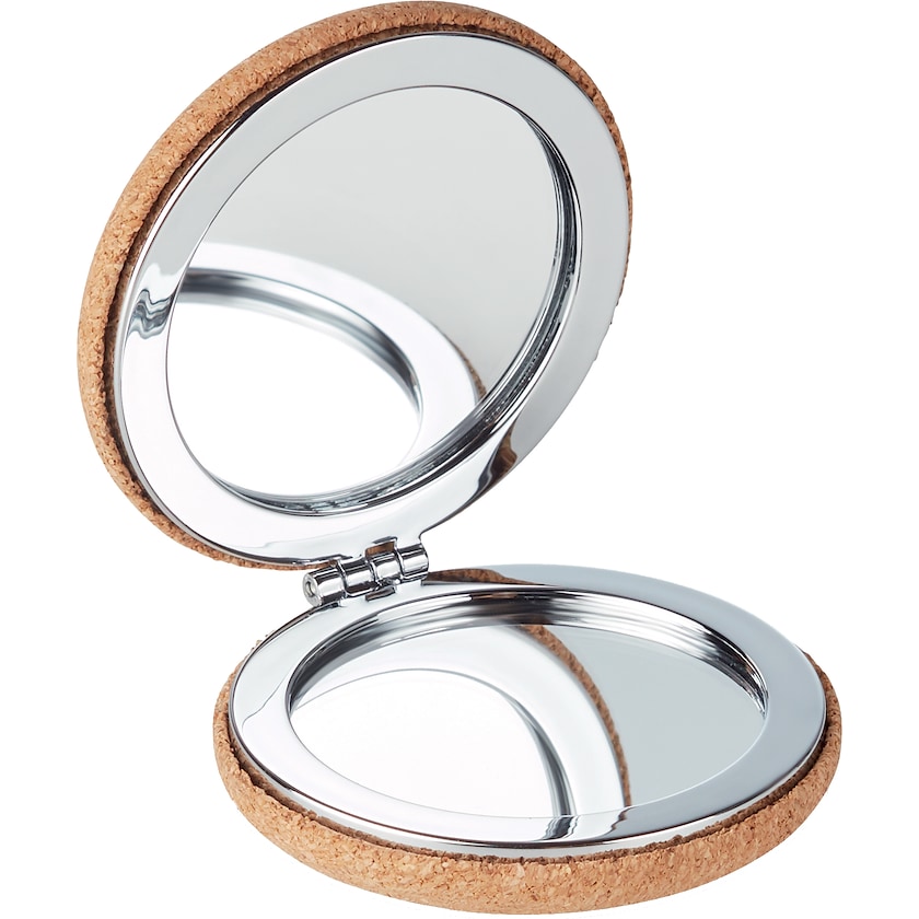 Doppelter Schminkspiegel mit Korkaußenseite. Kork ist ein natürliches Material, das alle Exemplare einzigartig macht. Die Kennzeichnung kann wahlweise mit Druck oder Lasergravur erfolgen.