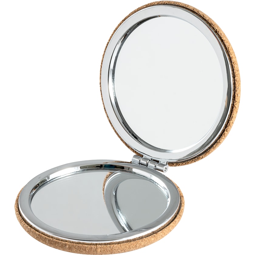 Runder Schminkspiegel mit Außenseite aus Kork. Melinda hat doppeltes Spiegelglas und wird in einer Papierhülle aus naturfarbenem Papier geliefert. Die Markierung erfolgt mittels Lasergravur.