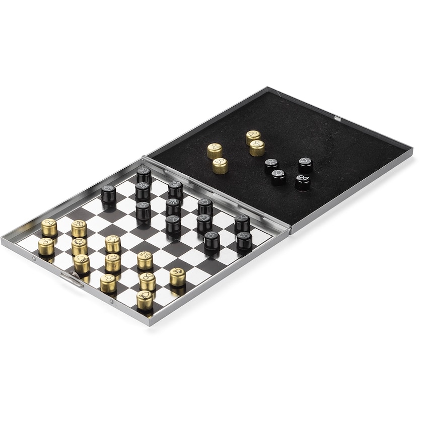 Elegantes minimalistisches Schachspiel. Durch sein kleines Format ist Grandmaster perfekt zum Mitnehmen auf eine Reise oder an den Strand. Die Figuren sind magnetisch, was bedeutet, dass sie nicht versehentlich verstellt werden können. Alle Teile sind aus Aluminium. Geliefert in einem grauen Karton. Die Beschriftung erfolgt mit Druck- oder Lasergravur.