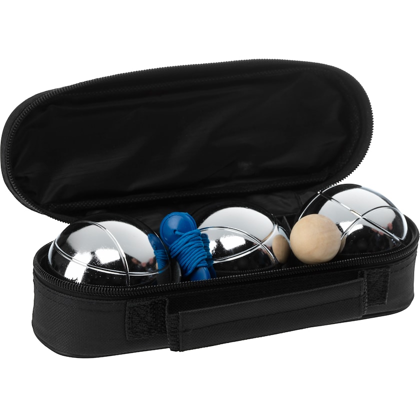 Bouleset mit drei Kugeln. Das Set kommt in einer praktischen Aufbewahrungstasche. Der Druck wird auf der Tasche platziert.