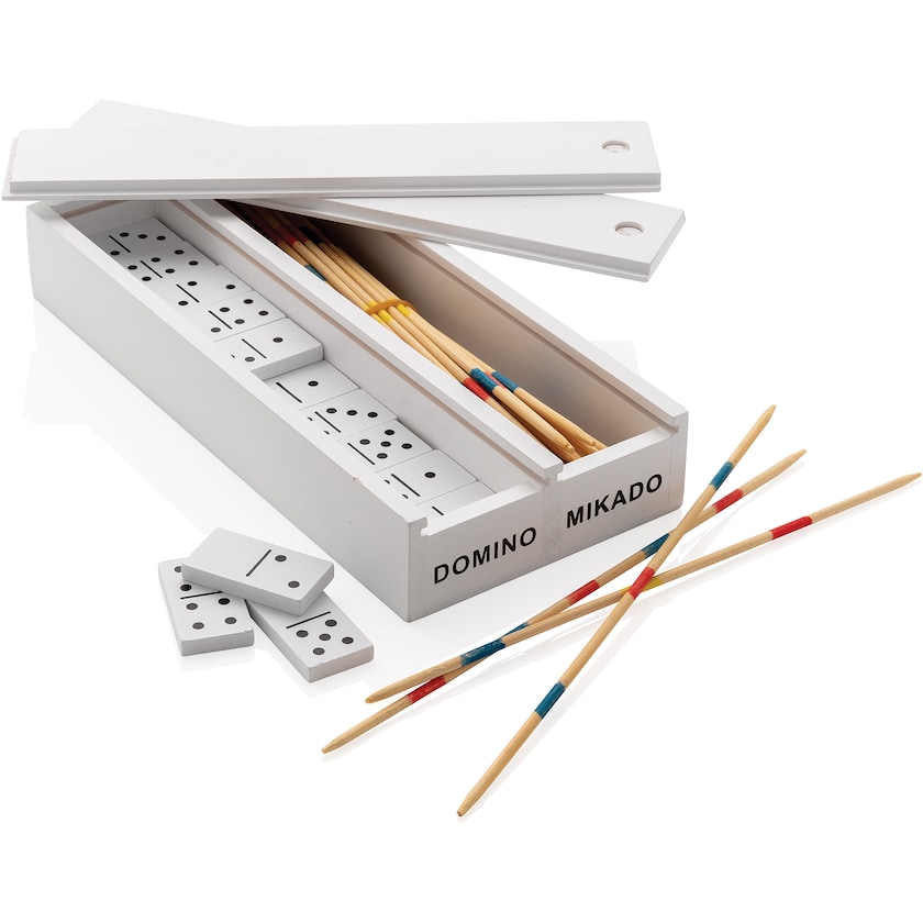 Spielset bestehend aus den beiden Klassikern Mikado und Domino. Die Spiele kommen in einer eleganten weißen Aufbewahrungsbox und werden samt Pappverpackung geliefert. Ein perfektes Geschenk für alle, die ein Spiel verschenken möchten, das nie aus der Mode kommt.