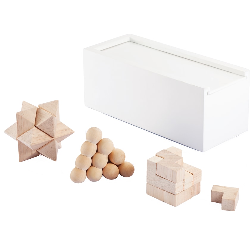 Set mit drei 3D-Puzzles aus FSC-zertifiziertem Holz. Trainieren Sie sich darin, Probleme zu analysieren und zu lösen. Das Spiel wird in einer Geschenkbox aus FSC-zertifiziertem Papier geliefert. Gedruckt wird auf die Aufbewahrungsbox.