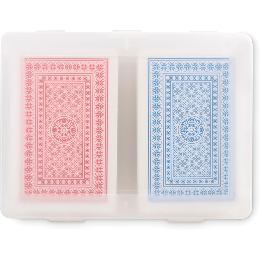 Set aus zwei Kartendecks mit Ihrem eigenen Druck. Die Decks bestehen jeweils aus 54 Karten und haben eine blaue bzw. rote Rückseite. Lieferung in einem Karton aus recyceltem Polypropylen.