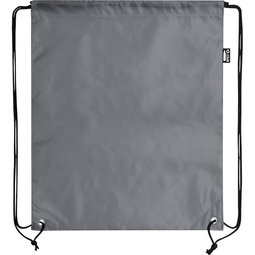 Umweltfreundlicher Turnbeutel aus rPET, sprich aus recycelten PET-Flaschen. Der Turnbeutel hat ein kleines Etikett, das auf das rPET hinweist. Eine umweltfreundliche Wahl.