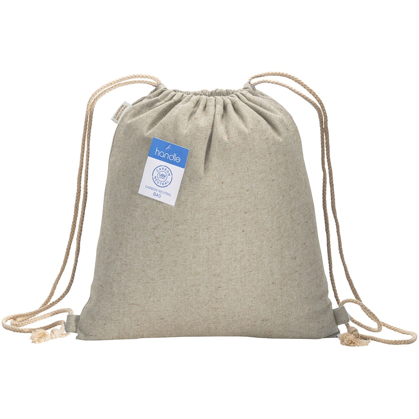 Turnbeutel mit meliertem Stoff aus recycelter Baumwolle. Gisele besteht aus einem starken 280-Gramm-Stoff mit naturfarbenen Baumwollschnüren. Die Herstellung des Stoffes erfolgt komplett CO2-neutral. An dem Turnbeutel befindet sich ein Etikett, das dies anzeigt.